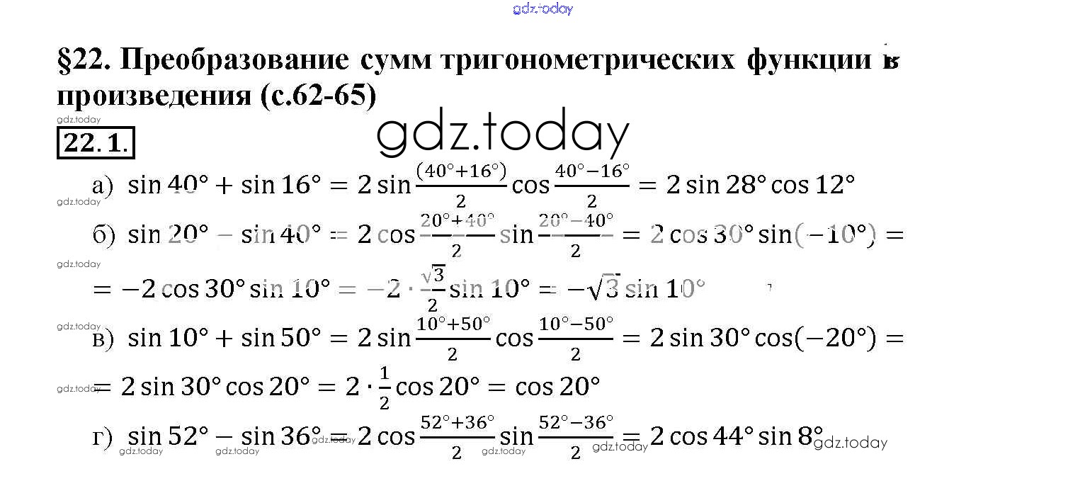 На страницах сайта gdz.today вы найдете учебный и вспомогательный материал, направленный на улучшения знаний школьной программы. ГДЗ - онлайн мир знаний §22. Преобразование суммы тригонометрических функций в произведения Глава 4 22. 1 Задачнику по Алгебре для 10-11 класса Мордкович, Денищева Базовый уровень Мнемозина 2015