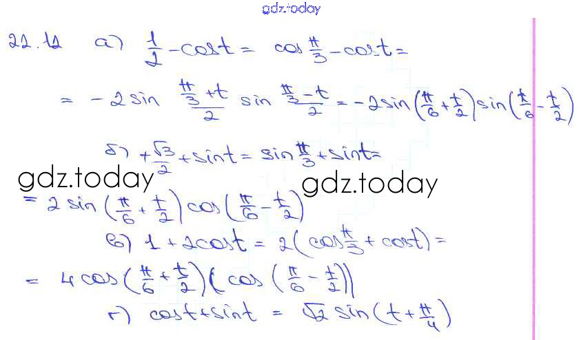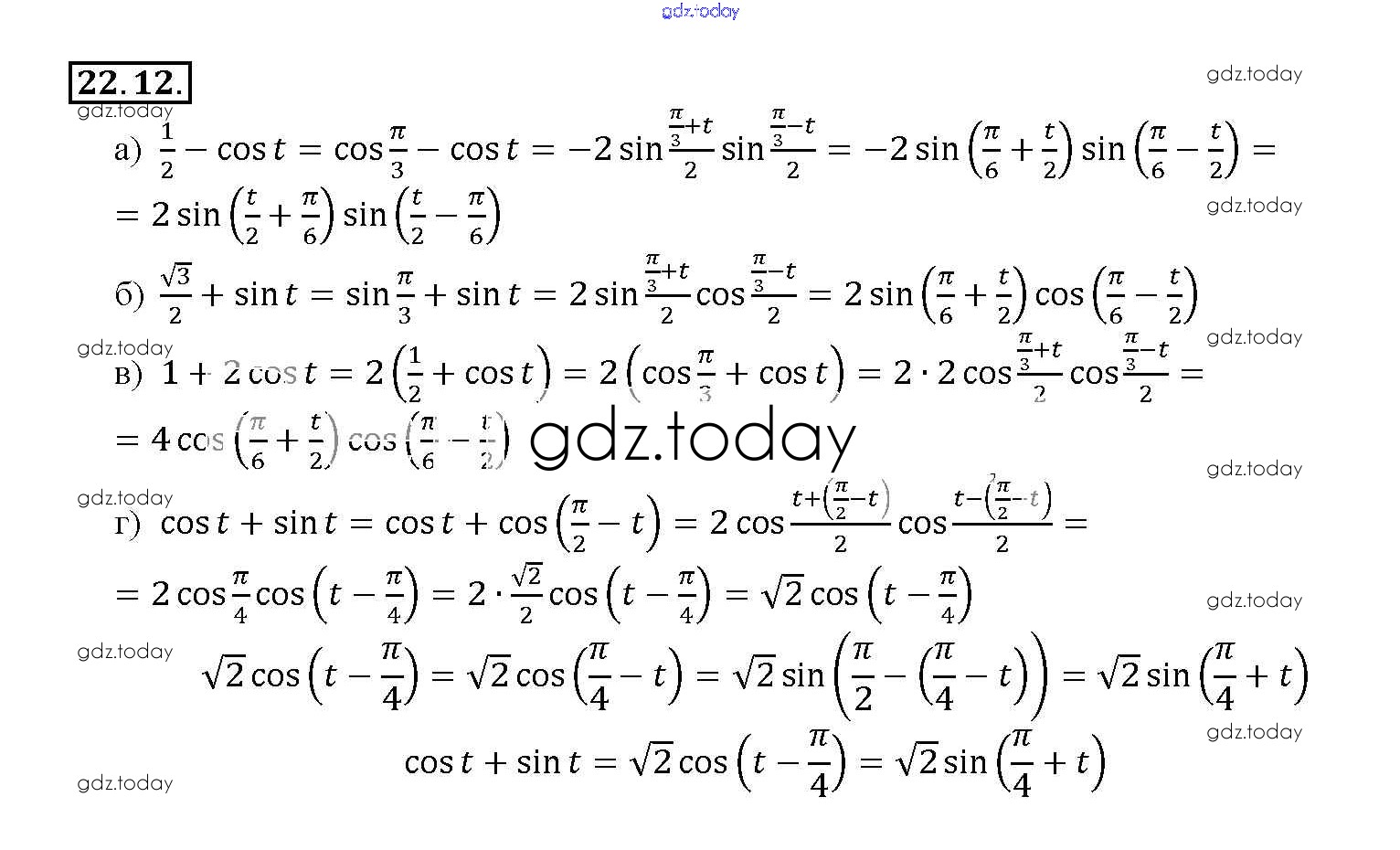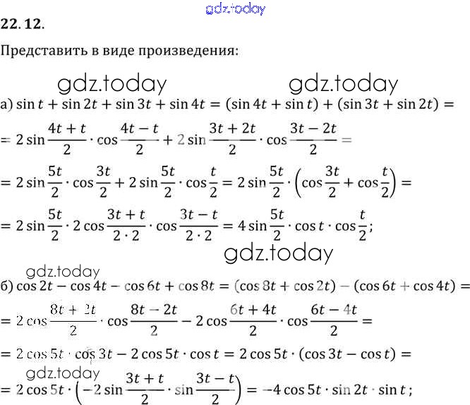 Ответы к §22. Преобразование суммы тригонометрических функций в произведения Глава 4 22. 12 Задачнику по Алгебре для 10-11 класса Мордкович, Денищева Базовый уровень Мнемозина 2015