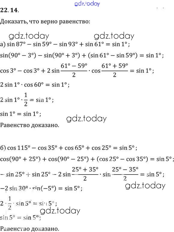 Ответы к §22. Преобразование суммы тригонометрических функций в произведения Глава 4 22. 14 Задачнику по Алгебре для 10-11 класса Мордкович, Денищева Базовый уровень Мнемозина 2015