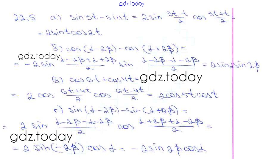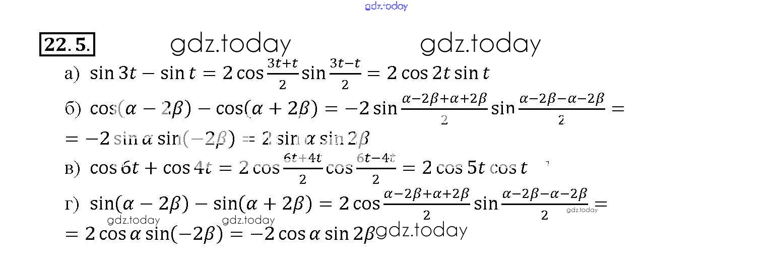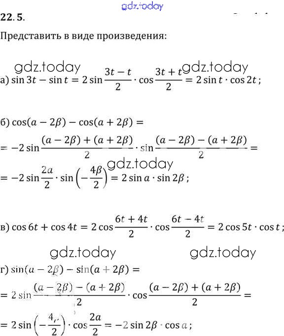 На страницах сайта gdz.today вы найдете учебный и вспомогательный материал, направленный на улучшения знаний школьной программы. ГДЗ - онлайн мир знаний §22. Преобразование суммы тригонометрических функций в произведения Глава 4 22. 5 Задачнику по Алгебре для 10-11 класса Мордкович, Денищева Базовый уровень Мнемозина 2015