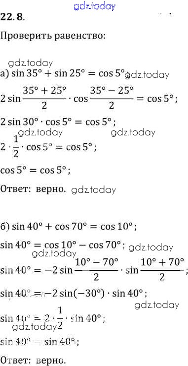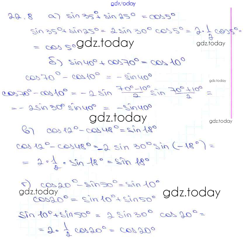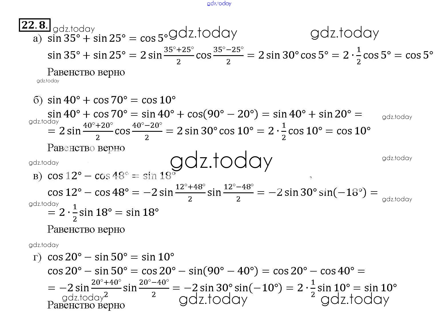 Ответы к §22. Преобразование суммы тригонометрических функций в произведения Глава 4 22. 8 Задачнику по Алгебре для 10-11 класса Мордкович, Денищева Базовый уровень Мнемозина 2015