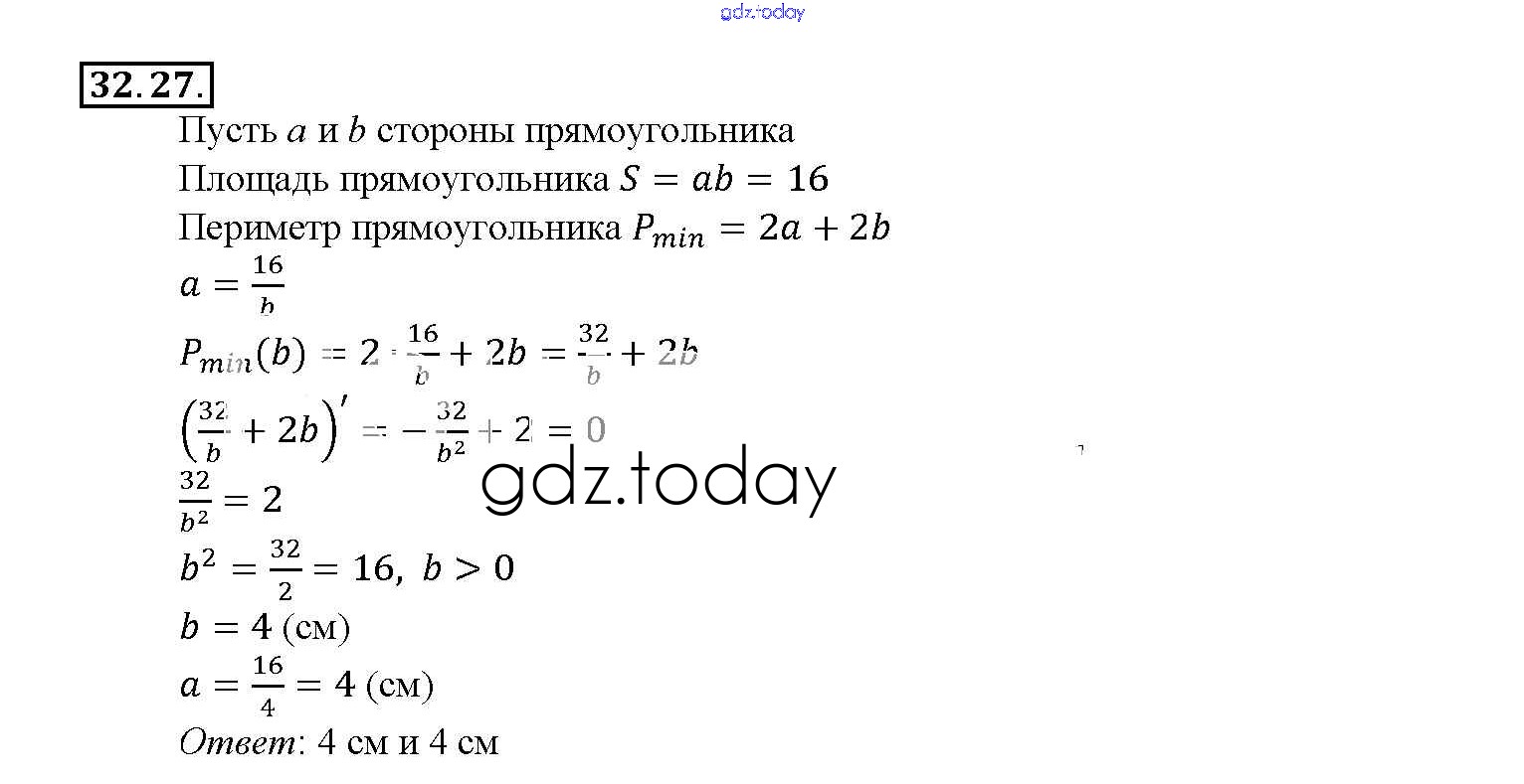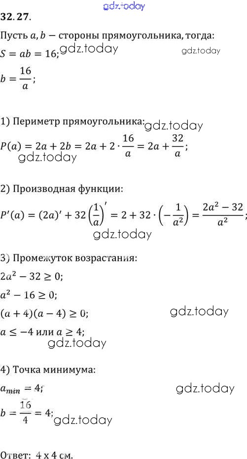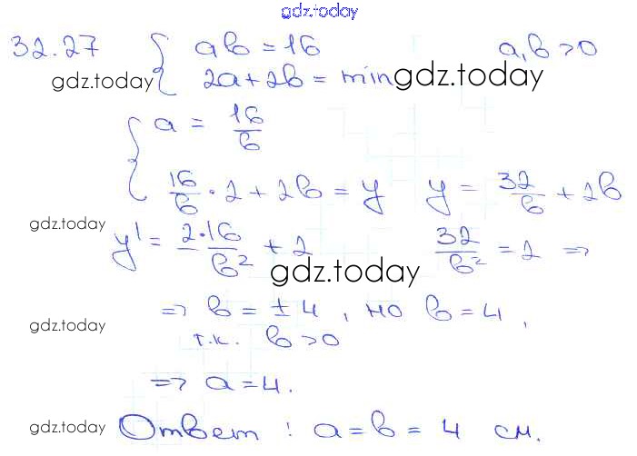 Ответы к §32. Применение производной для нахождения наибольших и наименьших значений величин Глава 5 32. 27 Задачнику по Алгебре для 10-11 класса Мордкович, Денищева Базовый уровень Мнемозина 2015
