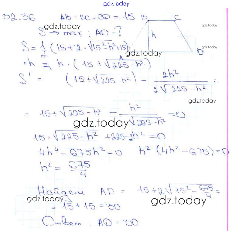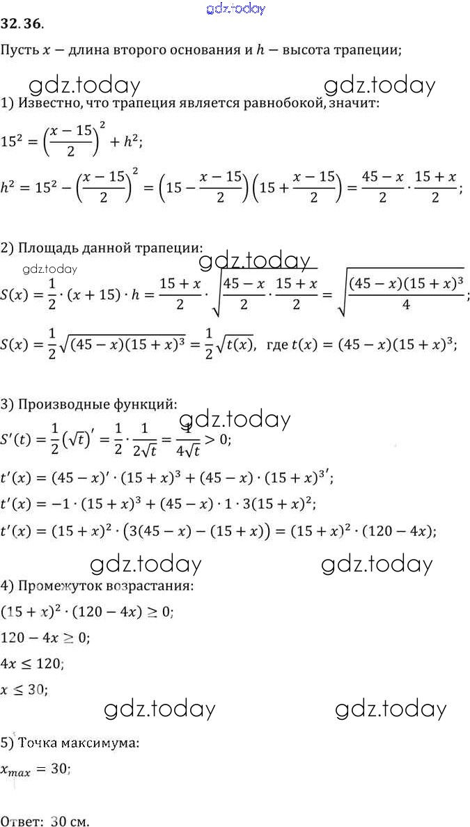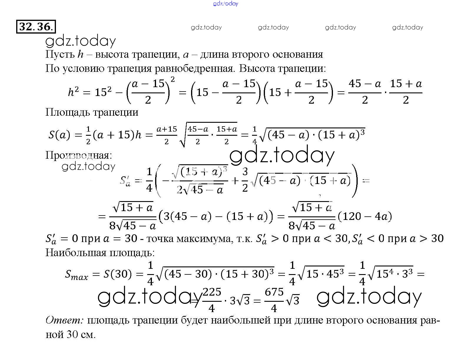 Ответы к §32. Применение производной для нахождения наибольших и наименьших значений величин Глава 5 32. 36 Задачнику по Алгебре для 10-11 класса Мордкович, Денищева Базовый уровень Мнемозина 2015