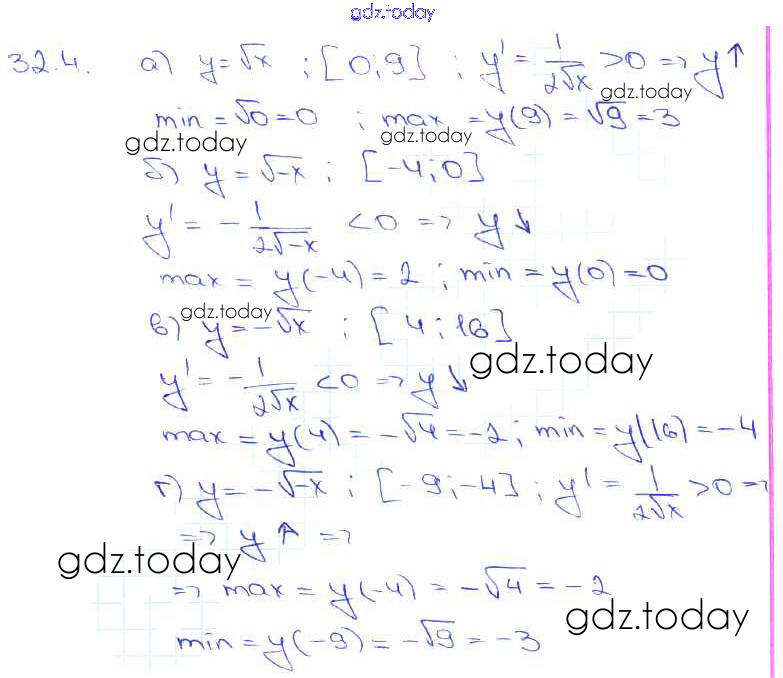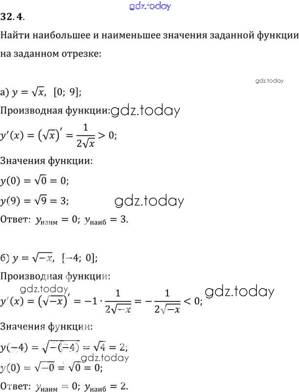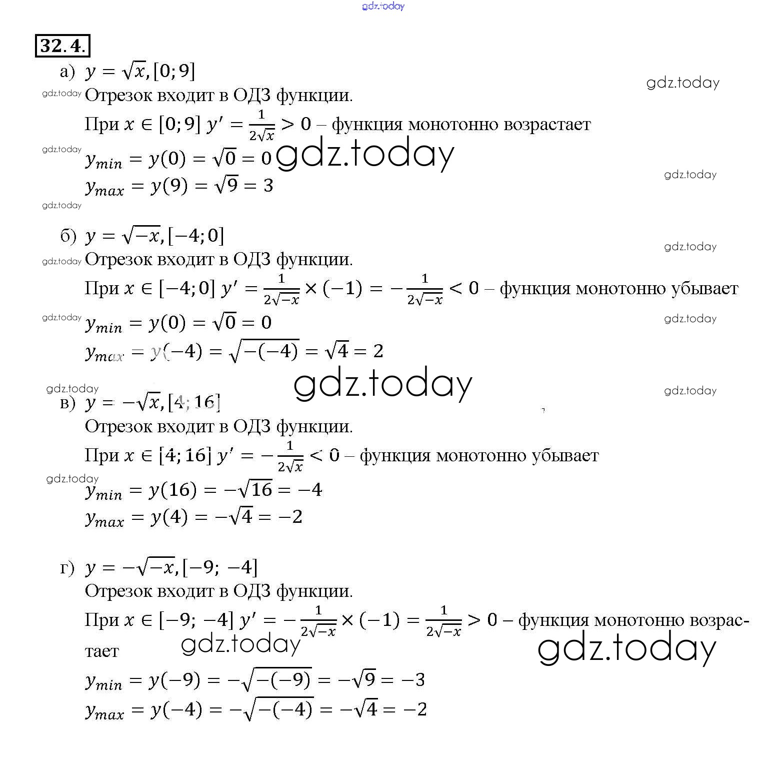 Ответы к §32. Применение производной для нахождения наибольших и наименьших значений величин Глава 5 32. 4 Задачнику по Алгебре для 10-11 класса Мордкович, Денищева Базовый уровень Мнемозина 2015
