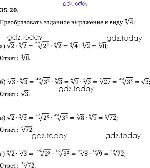 Ответы к §35. Свойства корня n-й степени Глава 6 35. 20 Задачнику по Алгебре для 10-11 класса Мордкович, Денищева Базовый уровень Мнемозина 2015