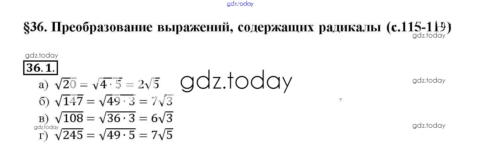 На страницах сайта gdz.today вы найдете учебный и вспомогательный материал, направленный на улучшения знаний школьной программы. ГДЗ - онлайн мир знаний §36. Преобразование выражений, содержащих радикалы Глава 6 36. 1 Задачнику по Алгебре для 10-11 класса Мордкович, Денищева Базовый уровень Мнемозина 2015