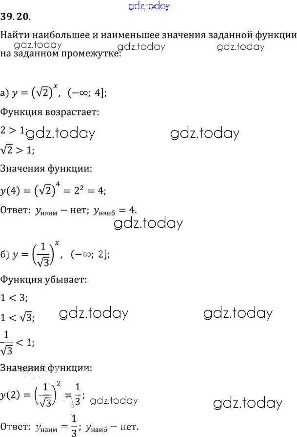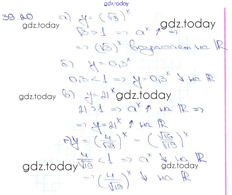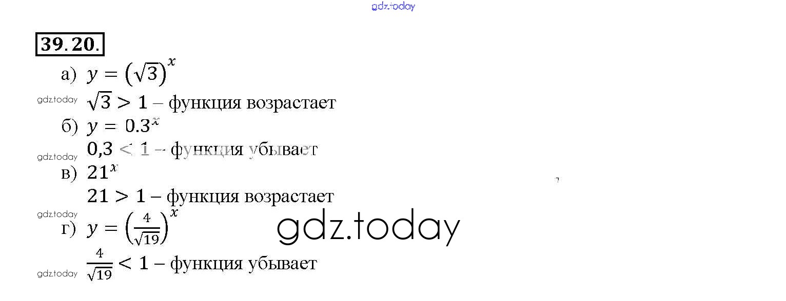На страницах сайта gdz.today вы найдете учебный и вспомогательный материал, направленный на улучшения знаний школьной программы. ГДЗ - онлайн мир знаний §39. Показательная функция, ее свойства и график Глава 7 39. 20 Задачнику по Алгебре для 10-11 класса Мордкович, Денищева Базовый уровень Мнемозина 2015
