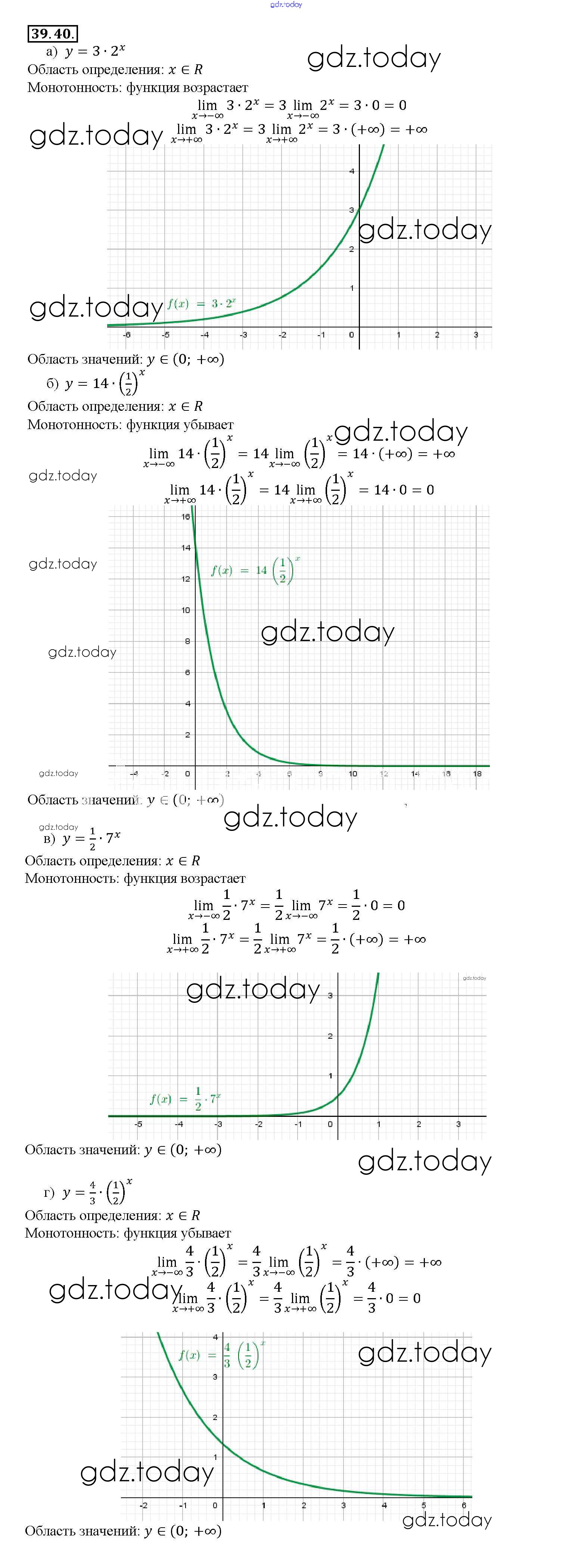 На страницах сайта gdz.today вы найдете учебный и вспомогательный материал, направленный на улучшения знаний школьной программы. ГДЗ - онлайн мир знаний §39. Показательная функция, ее свойства и график Глава 7 39. 40 Задачнику по Алгебре для 10-11 класса Мордкович, Денищева Базовый уровень Мнемозина 2015