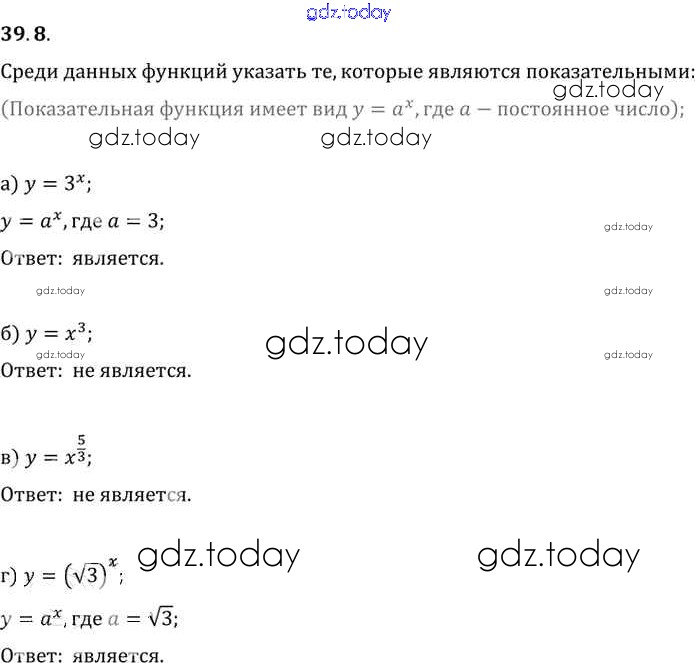 На страницах сайта gdz.today вы найдете учебный и вспомогательный материал, направленный на улучшения знаний школьной программы. ГДЗ - онлайн мир знаний §39. Показательная функция, ее свойства и график Глава 7 39. 8 Задачнику по Алгебре для 10-11 класса Мордкович, Денищева Базовый уровень Мнемозина 2015