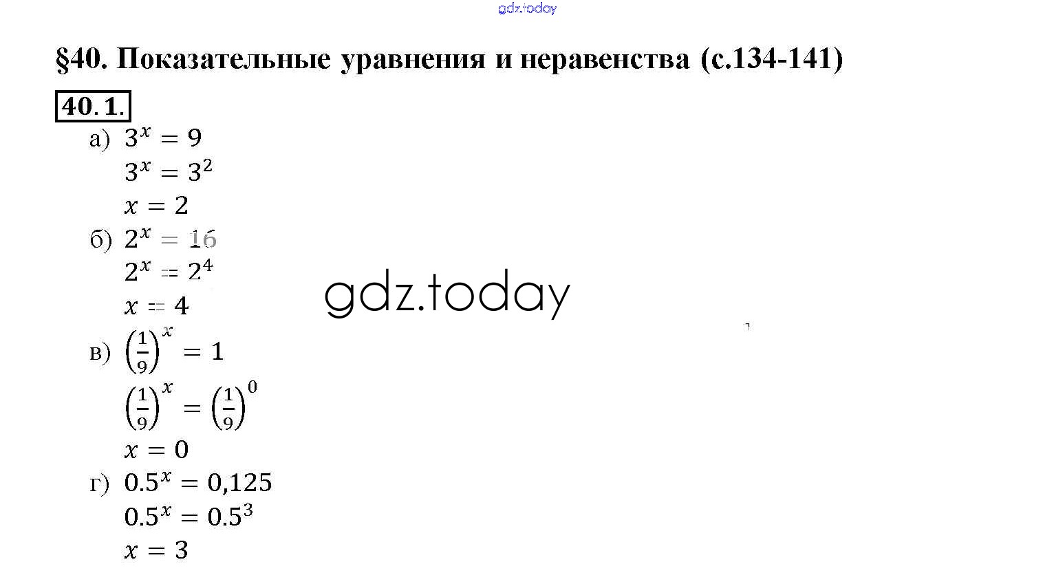 На страницах сайта gdz.today вы найдете учебный и вспомогательный материал, направленный на улучшения знаний школьной программы. ГДЗ - онлайн мир знаний §40. Показательные уравнения и неравенства Глава 7 40. 1 Задачнику по Алгебре для 10-11 класса Мордкович, Денищева Базовый уровень Мнемозина 2015