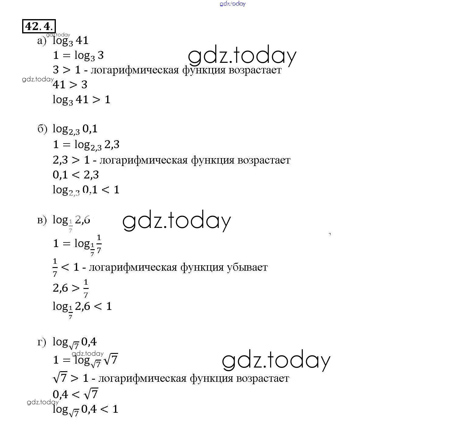На страницах сайта gdz.today вы найдете учебный и вспомогательный материал, направленный на улучшения знаний школьной программы. ГДЗ - онлайн мир знаний §42. Функция y = loga x, ее свойства и график Глава 7 42. 4 Задачнику по Алгебре для 10-11 класса Мордкович, Денищева Базовый уровень Мнемозина 2015