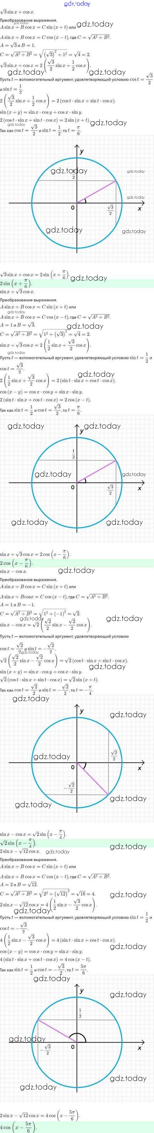 На страницах сайта gdz.today вы найдете учебный и вспомогательный материал, направленный на улучшения знаний школьной программы. ГДЗ - онлайн мир знаний Решение. §30. Преобразование выражения Asinx+Bcosx к виду Csin(x+t) 30.1 Задачнику по Алгебре для 10 класса Мордкович, Семёнов Базовый и углубленный уровень Мнемозина 2017