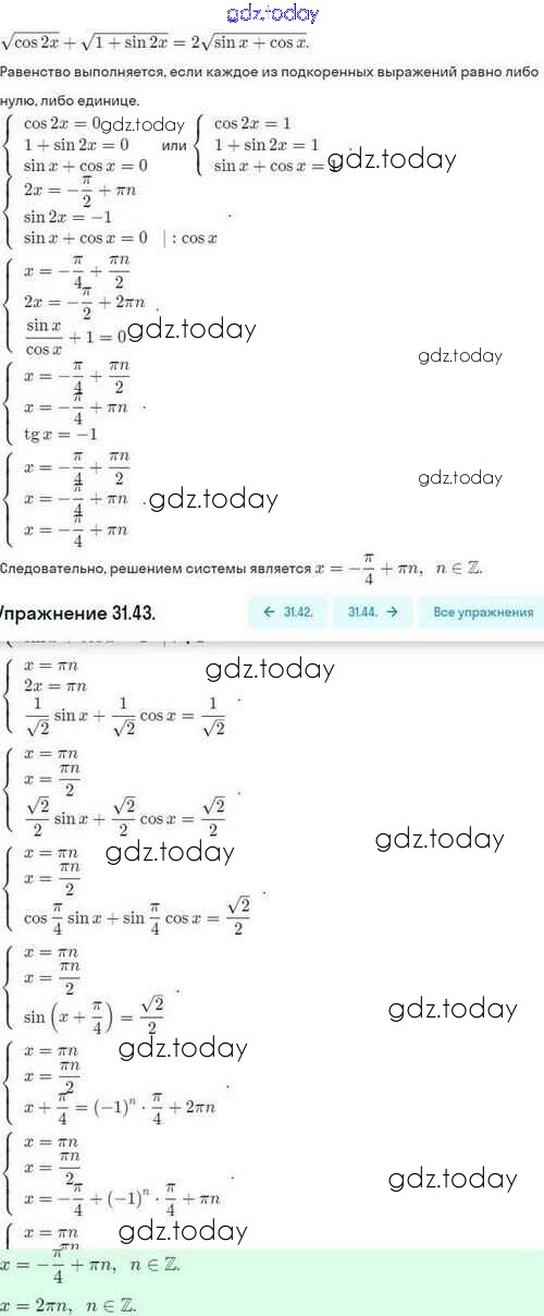 Ответы к Решение. §31. Методы решения тригонометрических уравнений 31.43 Задачнику по Алгебре для 10 класса Мордкович, Семёнов Базовый и углубленный уровень Мнемозина 2017
