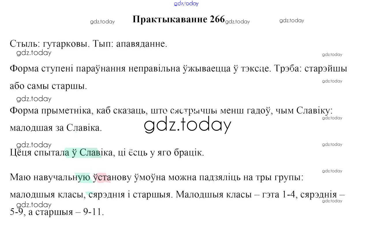 На страницах сайта gdz.today вы найдете учебный и вспомогательный материал, направленный на улучшения знаний школьной программы. ГДЗ - онлайн мир знаний Рашальнік да практыкаванняў 266 Учебнику по Белорусскому языку для 10 класса Валочка, Васюковіч Национальный институт образования 2016