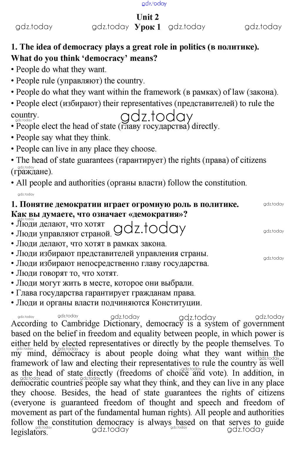На страницах сайта gdz.today вы найдете учебный и вспомогательный материал, направленный на улучшения знаний школьной программы. ГДЗ - онлайн мир знаний Lesson 1 Решение к Unit 2. Western Democracies. Are They Democratic? 1 Учебнику по Английскому языку для 10-11 класса Кузовлев, Лапа Просвещение 2012
