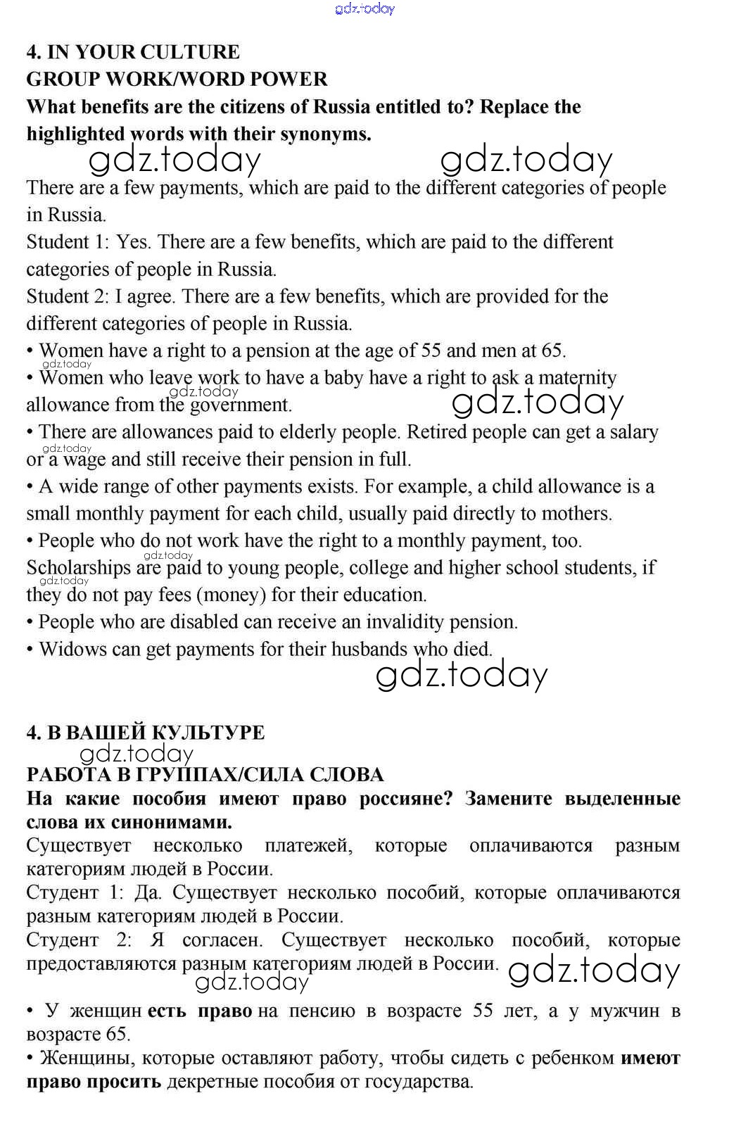 На страницах сайта gdz.today вы найдете учебный и вспомогательный материал, направленный на улучшения знаний школьной программы. ГДЗ - онлайн мир знаний Lesson 1 Решение к Unit 5. Is the System of Social Welfare Fair? 4 Учебнику по Английскому языку для 10-11 класса Кузовлев, Лапа Просвещение 2012