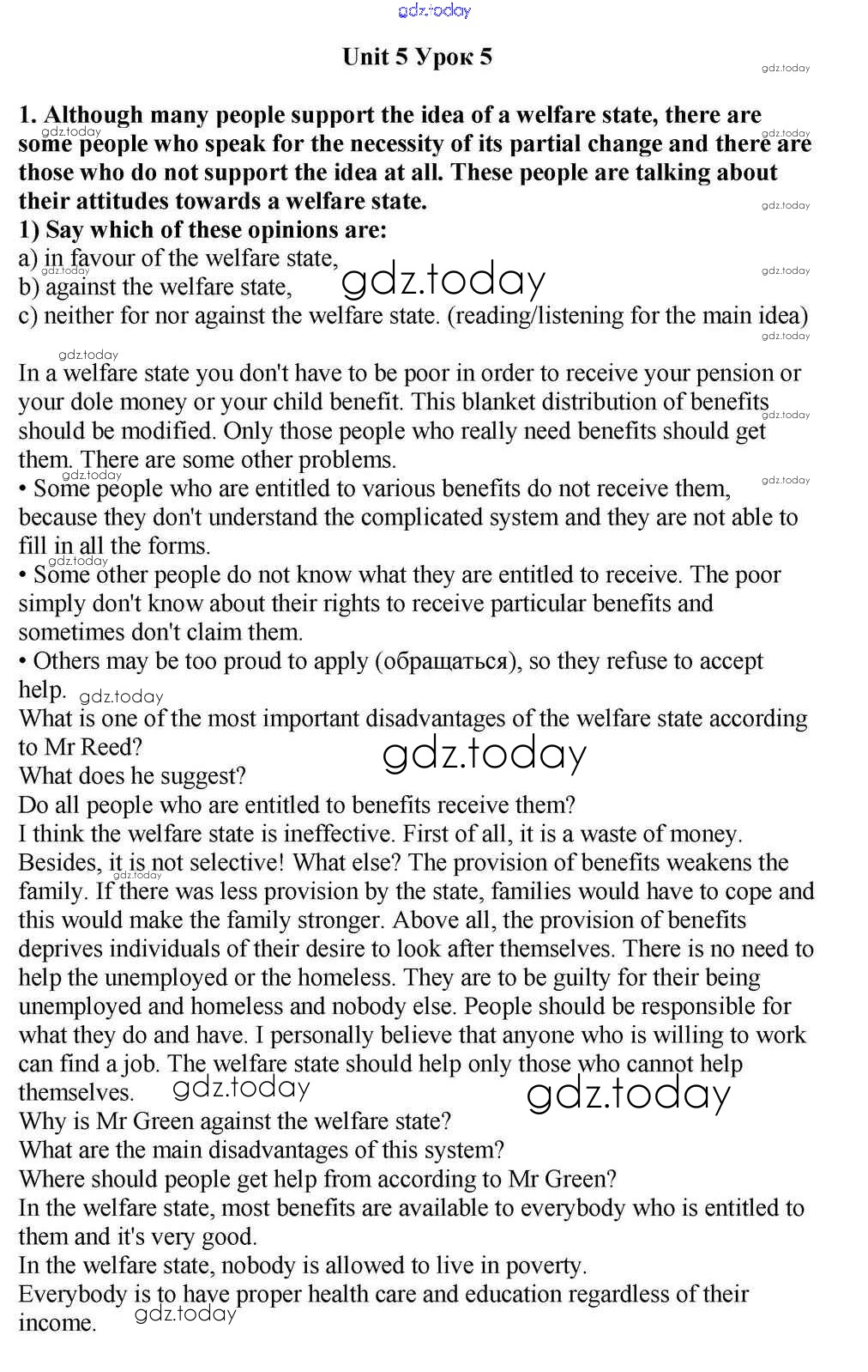 На страницах сайта gdz.today вы найдете учебный и вспомогательный материал, направленный на улучшения знаний школьной программы. ГДЗ - онлайн мир знаний Lesson 5 Решение к Unit 5. Is the System of Social Welfare Fair? 1 Учебнику по Английскому языку для 10-11 класса Кузовлев, Лапа  Просвещение  2012