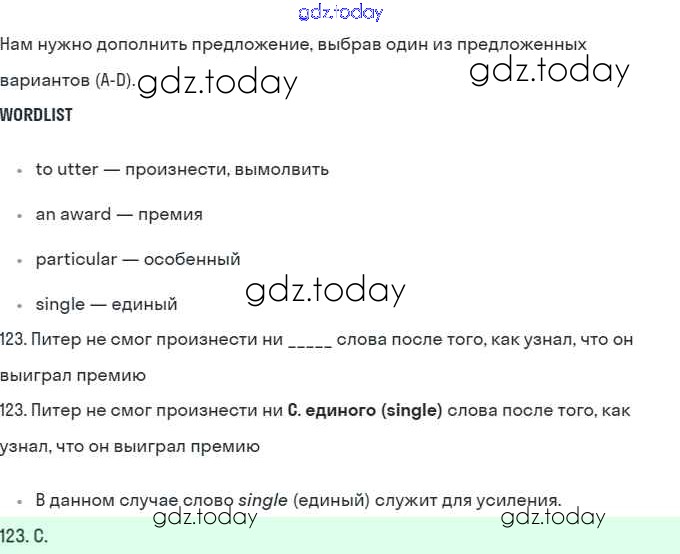 На страницах сайта gdz.today вы найдете учебный и вспомогательный материал, направленный на улучшения знаний школьной программы. ГДЗ - онлайн мир знаний B Решение. Further practice section 123 Рабочей тетради по Английскому языку для 10 класса Баранова, Дули Углубленный уровень Просвещение Starlight 2021