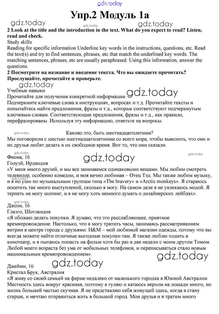 На страницах сайта gdz.today вы найдете учебный и вспомогательный материал, направленный на улучшения знаний школьной программы. ГДЗ - онлайн мир знаний Часть 1a Решение к Module 1 2 Учебнику по Английскому языку для 10 класса Афанасьева, Дули Просвещение Spotlight 2015