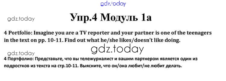 На страницах сайта gdz.today вы найдете учебный и вспомогательный материал, направленный на улучшения знаний школьной программы. ГДЗ - онлайн мир знаний Часть 1a Решение к Module 1 4 Учебнику по Английскому языку для 10 класса Афанасьева, Дули Просвещение Spotlight 2015