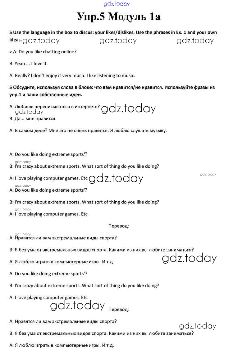 На страницах сайта gdz.today вы найдете учебный и вспомогательный материал, направленный на улучшения знаний школьной программы. ГДЗ - онлайн мир знаний Часть 1a Решение к Module 1 5 Учебнику по Английскому языку для 10 класса Афанасьева, Дули Просвещение Spotlight 2015