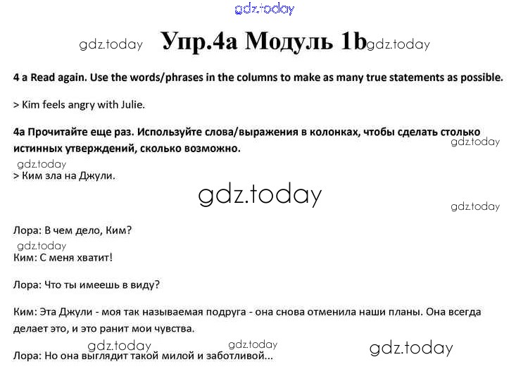 На страницах сайта gdz.today вы найдете учебный и вспомогательный материал, направленный на улучшения знаний школьной программы. ГДЗ - онлайн мир знаний Часть 1b Решение к Module 1 4a Учебнику по Английскому языку для 10 класса Афанасьева, Дули Просвещение Spotlight 2015
