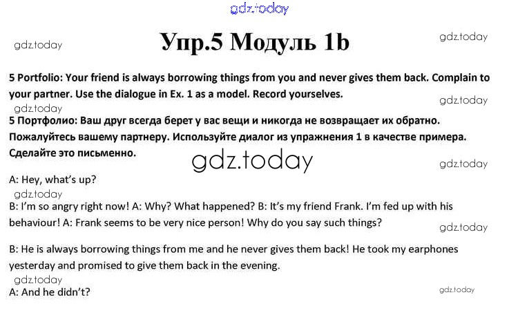 На страницах сайта gdz.today вы найдете учебный и вспомогательный материал, направленный на улучшения знаний школьной программы. ГДЗ - онлайн мир знаний Часть 1b Решение к Module 1 5 Учебнику по Английскому языку для 10 класса Афанасьева, Дули Просвещение Spotlight 2015