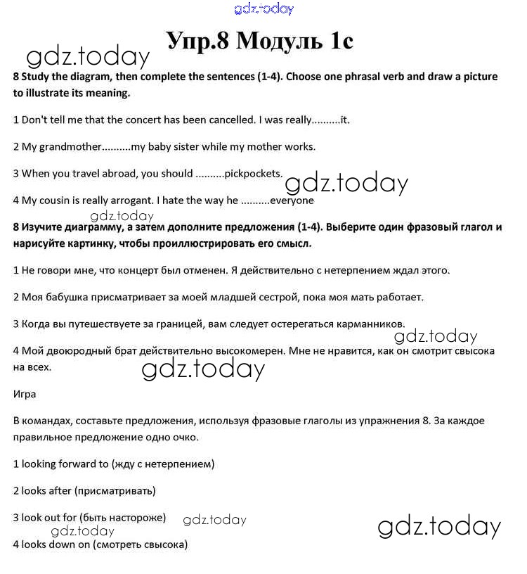 На страницах сайта gdz.today вы найдете учебный и вспомогательный материал, направленный на улучшения знаний школьной программы. ГДЗ - онлайн мир знаний Часть 1c Решение к Module 1 8 Учебнику по Английскому языку для 10 класса Афанасьева, Дули Просвещение Spotlight 2015