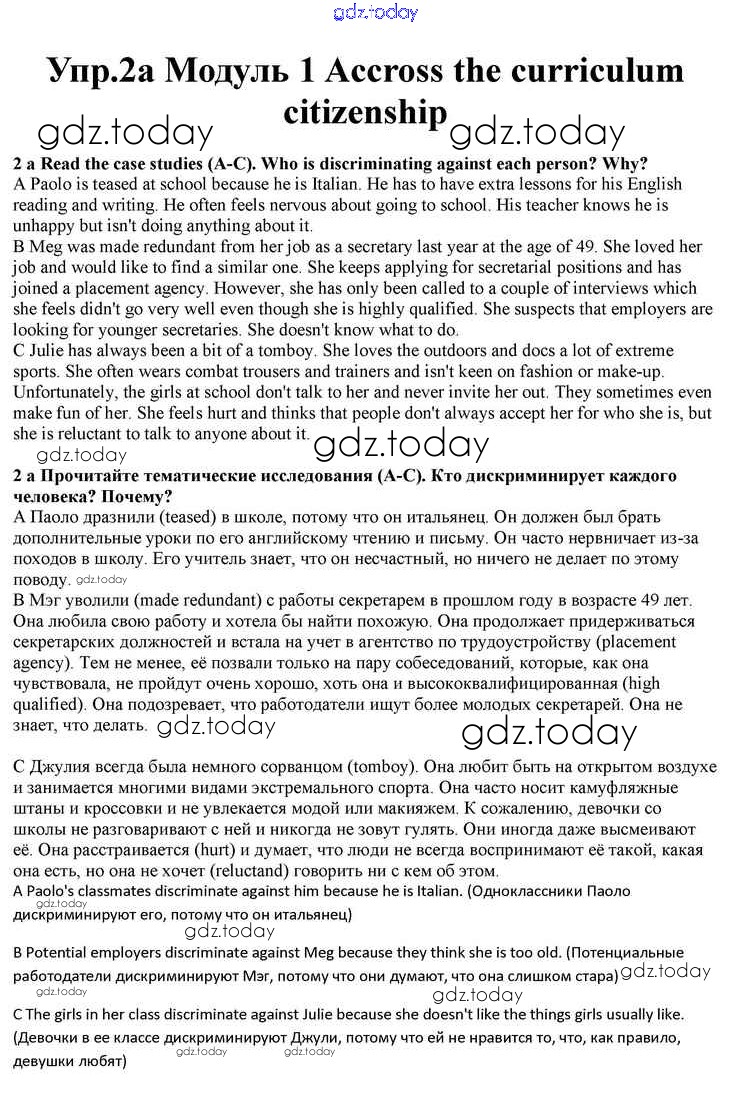 На страницах сайта gdz.today вы найдете учебный и вспомогательный материал, направленный на улучшения знаний школьной программы. ГДЗ - онлайн мир знаний Accross the curriculum Citizenship Решение к Module 1 2a Учебнику по Английскому языку для 10 класса Афанасьева, Дули Просвещение Spotlight 2015