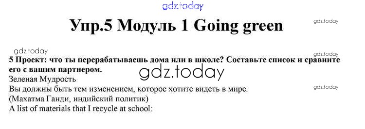 На страницах сайта gdz.today вы найдете учебный и вспомогательный материал, направленный на улучшения знаний школьной программы. ГДЗ - онлайн мир знаний Going green Решение к Module 1 5 Учебнику по Английскому языку для 10 класса Афанасьева, Дули Просвещение Spotlight 2015