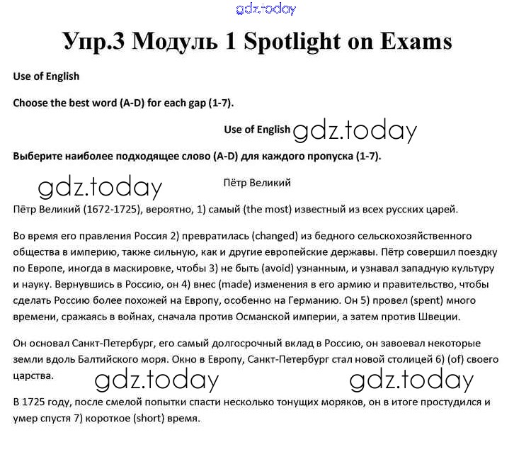 На страницах сайта gdz.today вы найдете учебный и вспомогательный материал, направленный на улучшения знаний школьной программы. ГДЗ - онлайн мир знаний Spotlight on Exams Решение к Module 1 3 Учебнику по Английскому языку для 10 класса Афанасьева, Дули Просвещение Spotlight 2015