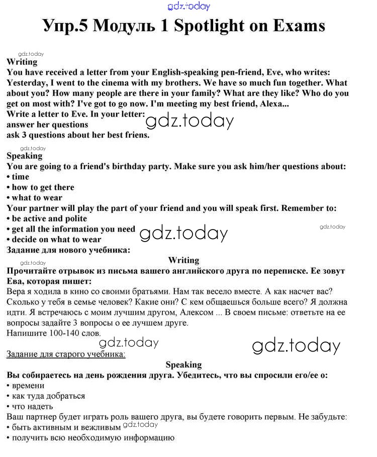 На страницах сайта gdz.today вы найдете учебный и вспомогательный материал, направленный на улучшения знаний школьной программы. ГДЗ - онлайн мир знаний Spotlight on Exams Решение к Module 1 5 Учебнику по Английскому языку для 10 класса Афанасьева, Дули Просвещение Spotlight 2015