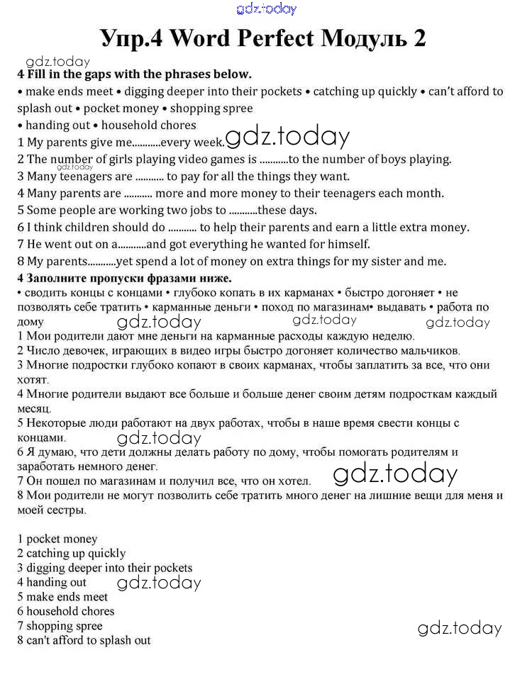 На страницах сайта gdz.today вы найдете учебный и вспомогательный материал, направленный на улучшения знаний школьной программы. ГДЗ - онлайн мир знаний Module 2 Word Perfect 4 Учебнику по Английскому языку для 10 класса Афанасьева, Дули Просвещение Spotlight 2015