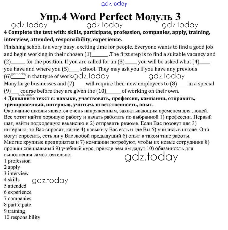 На страницах сайта gdz.today вы найдете учебный и вспомогательный материал, направленный на улучшения знаний школьной программы. ГДЗ - онлайн мир знаний Module 3 Word Perfect 4 Учебнику по Английскому языку для 10 класса Афанасьева, Дули Просвещение Spotlight 2015