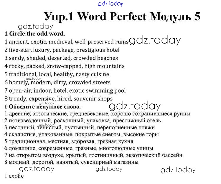 На страницах сайта gdz.today вы найдете учебный и вспомогательный материал, направленный на улучшения знаний школьной программы. ГДЗ - онлайн мир знаний Module 5 Word Perfect 1 Учебнику по Английскому языку для 10 класса Афанасьева, Дули Просвещение Spotlight 2015