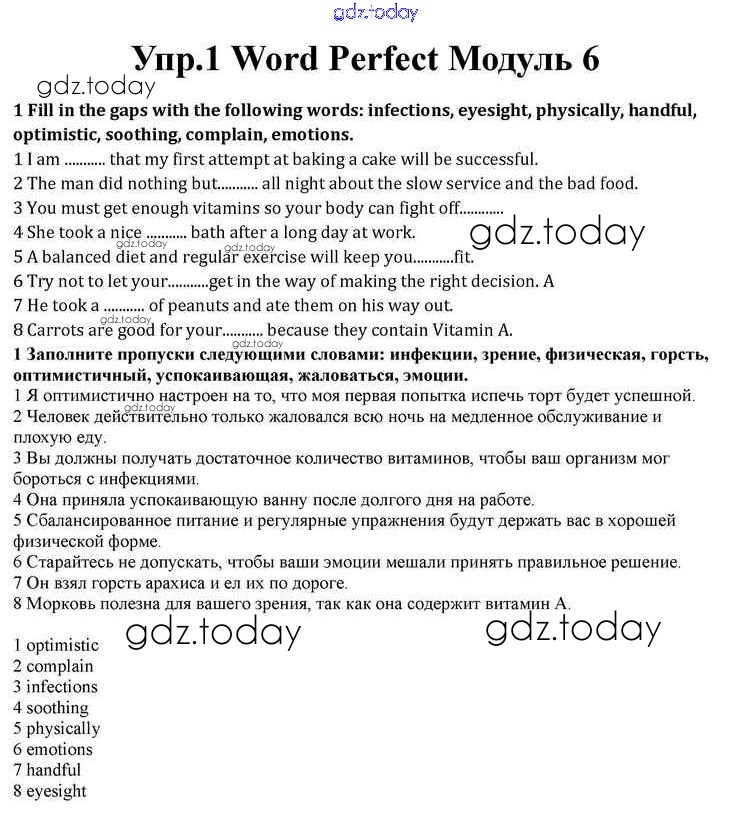 На страницах сайта gdz.today вы найдете учебный и вспомогательный материал, направленный на улучшения знаний школьной программы. ГДЗ - онлайн мир знаний Module 6 Word Perfect 1 Учебнику по Английскому языку для 10 класса Афанасьева, Дули Просвещение Spotlight 2015