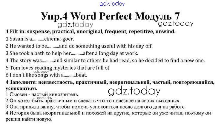 На страницах сайта gdz.today вы найдете учебный и вспомогательный материал, направленный на улучшения знаний школьной программы. ГДЗ - онлайн мир знаний Module 7 Word Perfect 4 Учебнику по Английскому языку для 10 класса Афанасьева, Дули Просвещение Spotlight 2015