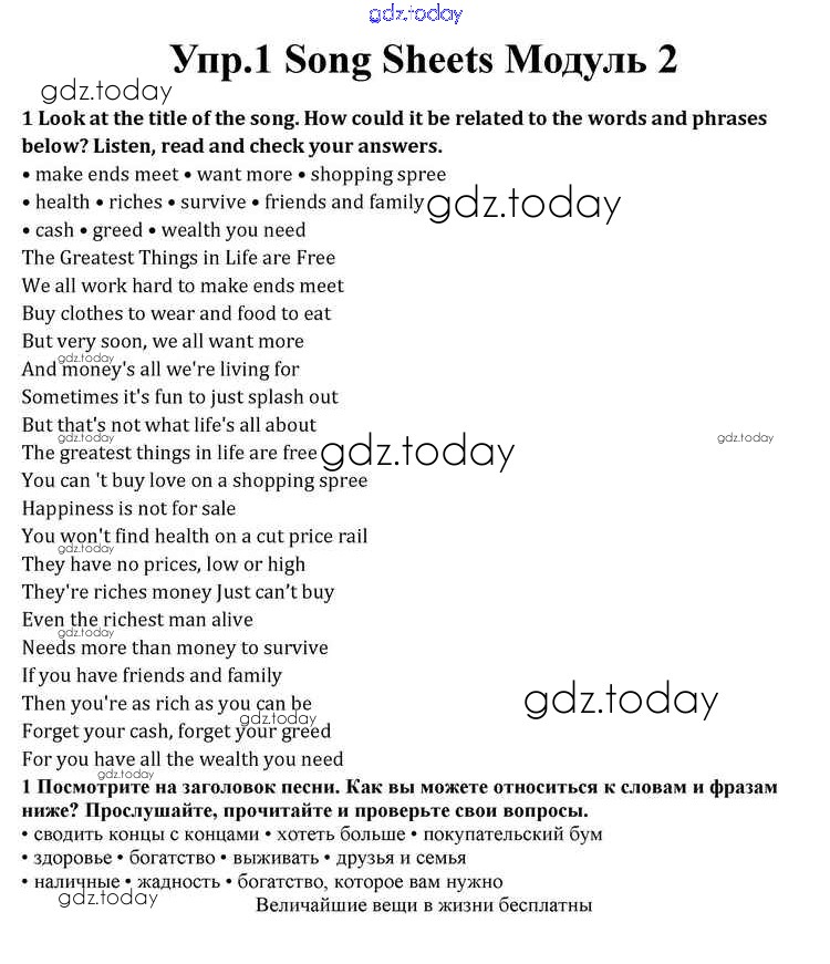 На страницах сайта gdz.today вы найдете учебный и вспомогательный материал, направленный на улучшения знаний школьной программы. ГДЗ - онлайн мир знаний Module 2 Song Sheets 1 Учебнику по Английскому языку для 10 класса Афанасьева, Дули Просвещение Spotlight 2015
