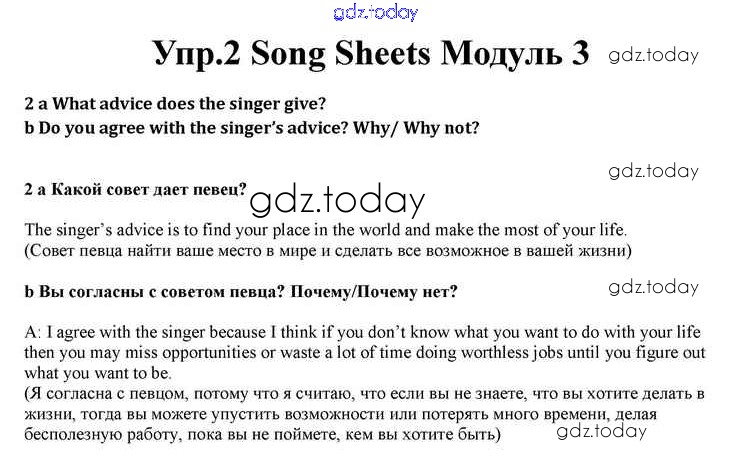 На страницах сайта gdz.today вы найдете учебный и вспомогательный материал, направленный на улучшения знаний школьной программы. ГДЗ - онлайн мир знаний Module 3 Song Sheets 2 Учебнику по Английскому языку для 10 класса Афанасьева, Дули Просвещение Spotlight 2015