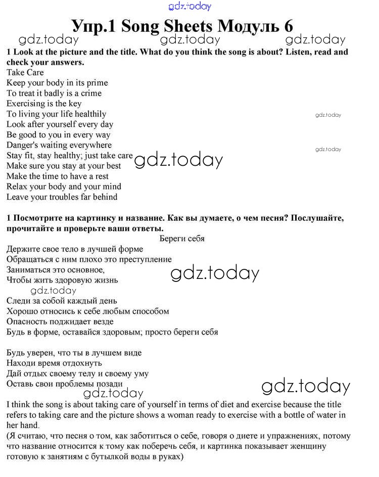 На страницах сайта gdz.today вы найдете учебный и вспомогательный материал, направленный на улучшения знаний школьной программы. ГДЗ - онлайн мир знаний Module 6 Song Sheets 1 Учебнику по Английскому языку для 10 класса Афанасьева, Дули Просвещение Spotlight 2015
