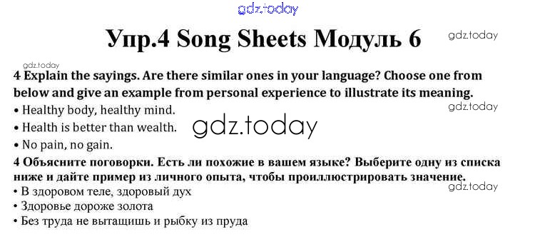 На страницах сайта gdz.today вы найдете учебный и вспомогательный материал, направленный на улучшения знаний школьной программы. ГДЗ - онлайн мир знаний Module 6 Song Sheets 4 Учебнику по Английскому языку для 10 класса Афанасьева, Дули Просвещение Spotlight 2015