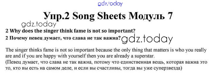 На страницах сайта gdz.today вы найдете учебный и вспомогательный материал, направленный на улучшения знаний школьной программы. ГДЗ - онлайн мир знаний Module 7 Song Sheets 2 Учебнику по Английскому языку для 10 класса Афанасьева, Дули Просвещение Spotlight 2015