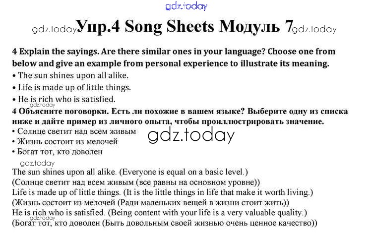 На страницах сайта gdz.today вы найдете учебный и вспомогательный материал, направленный на улучшения знаний школьной программы. ГДЗ - онлайн мир знаний Module 7 Song Sheets 4 Учебнику по Английскому языку для 10 класса Афанасьева, Дули Просвещение Spotlight 2015