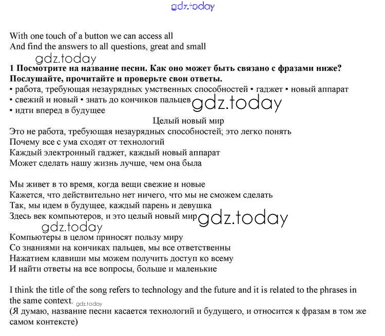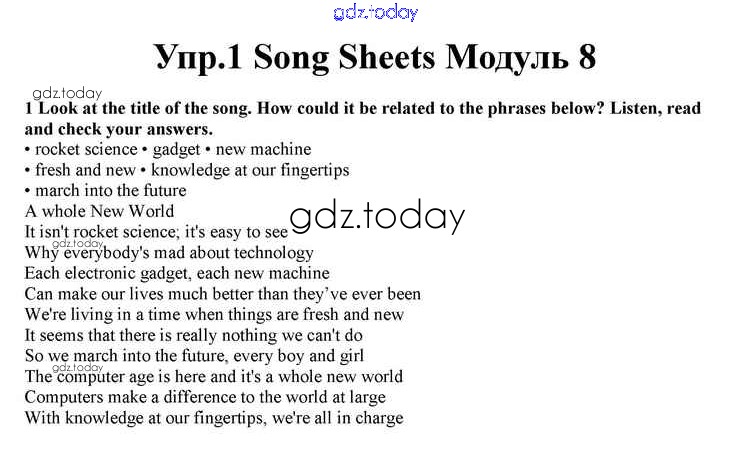 На страницах сайта gdz.today вы найдете учебный и вспомогательный материал, направленный на улучшения знаний школьной программы. ГДЗ - онлайн мир знаний Module 8 Song Sheets 1 Учебнику по Английскому языку для 10 класса Афанасьева, Дули Просвещение Spotlight 2015