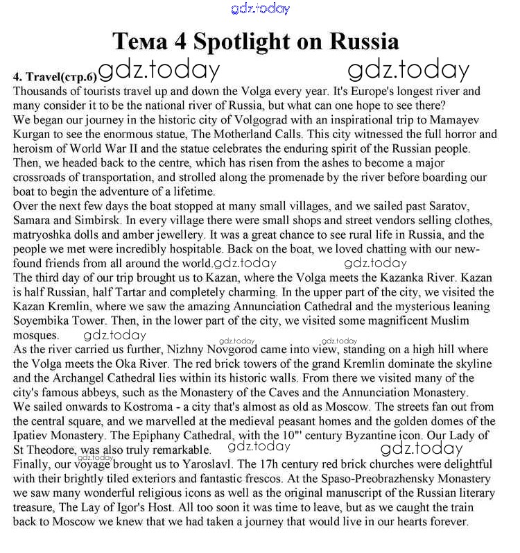 На страницах сайта gdz.today вы найдете учебный и вспомогательный материал, направленный на улучшения знаний школьной программы. ГДЗ - онлайн мир знаний Spotlight on Russia 4. Travel Учебнику по Английскому языку для 10 класса Афанасьева, Дули Просвещение Spotlight 2015
