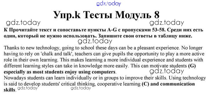 На страницах сайта gdz.today вы найдете учебный и вспомогательный материал, направленный на улучшения знаний школьной программы. ГДЗ - онлайн мир знаний Modul 8 Книга с тестами k Учебнику по Английскому языку для 10 класса Афанасьева, Дули Просвещение Spotlight 2015
