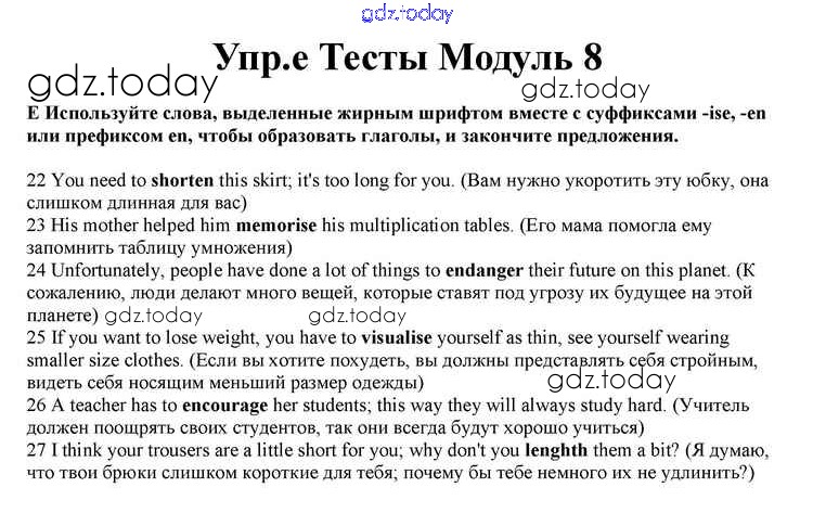На страницах сайта gdz.today вы найдете учебный и вспомогательный материал, направленный на улучшения знаний школьной программы. ГДЗ - онлайн мир знаний Modul 8 Книга с тестами e Учебнику по Английскому языку для 10 класса Афанасьева, Дули Просвещение Spotlight 2015