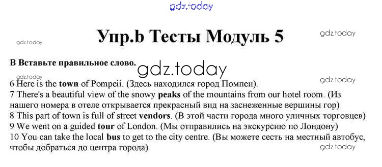 На страницах сайта gdz.today вы найдете учебный и вспомогательный материал, направленный на улучшения знаний школьной программы. ГДЗ - онлайн мир знаний Modul 5 Книга с тестами b Учебнику по Английскому языку для 10 класса Афанасьева, Дули Просвещение Spotlight 2015
