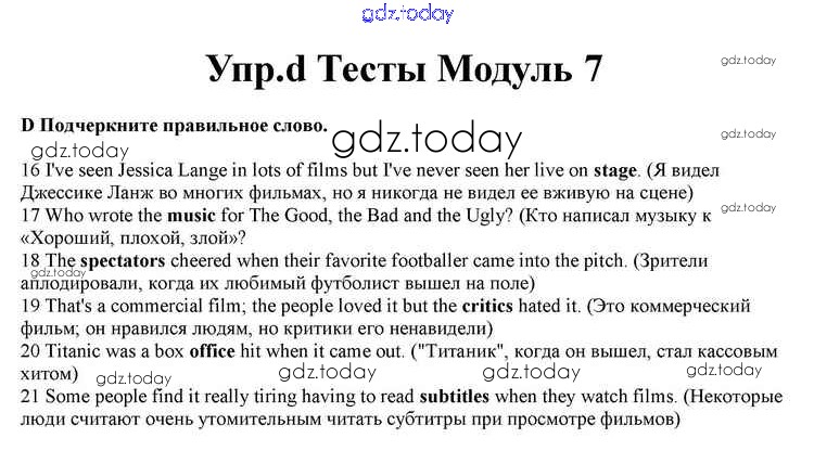 На страницах сайта gdz.today вы найдете учебный и вспомогательный материал, направленный на улучшения знаний школьной программы. ГДЗ - онлайн мир знаний Modul 7 Книга с тестами d Учебнику по Английскому языку для 10 класса Афанасьева, Дули Просвещение Spotlight 2015