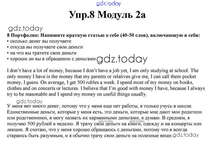 На страницах сайта gdz.today вы найдете учебный и вспомогательный материал, направленный на улучшения знаний школьной программы. ГДЗ - онлайн мир знаний Часть 2a Решение к Module 2 8 Учебнику по Английскому языку для 10 класса Афанасьева, Дули Просвещение Spotlight 2015